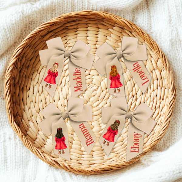 Add a touch of festive elegance to your holiday style with our 4-inch Christmas Cream Hair Clip! This beautiful accessory showcases a delightful illustration of a girl in a red coat, capturing the warmth and charm of the season. With a soft cream background and the option to personalise it with a name, this hair clip becomes a unique and thoughtful gift or a standout addition to your own holiday ensemble.