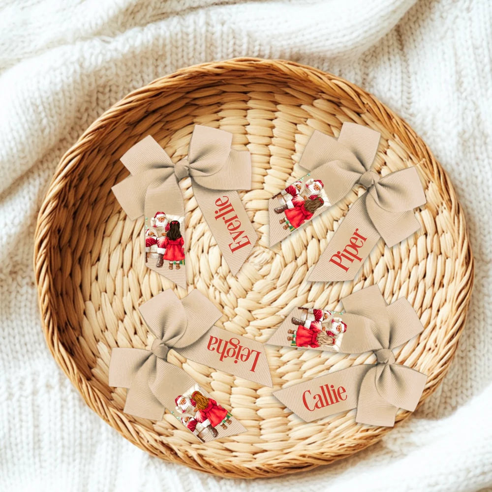 Add a touch of festive elegance to your holiday style with our 4-inch Christmas Cream Hair Clip! This beautiful accessory showcases a delightful illustration of a girl in a red coat visiting Santa, capturing the warmth and charm of the season. With a soft cream background and the option to personalise it with a name, this hair clip becomes a unique and thoughtful gift or a standout addition to your own holiday ensemble.