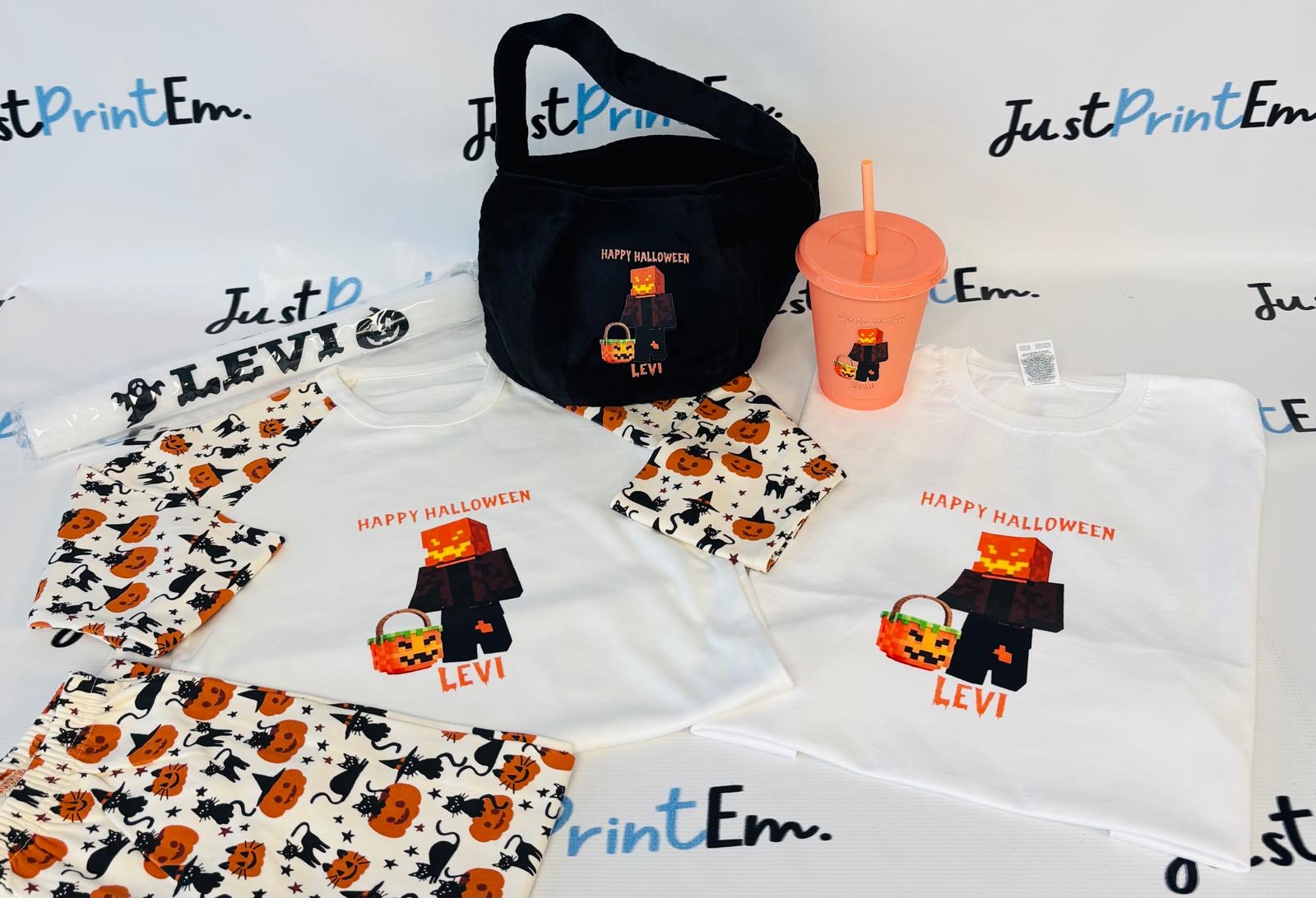 Our Halloween Whole Set includes the following items. (Please note we will choose style of pjs, cup and bag colour to suit design)