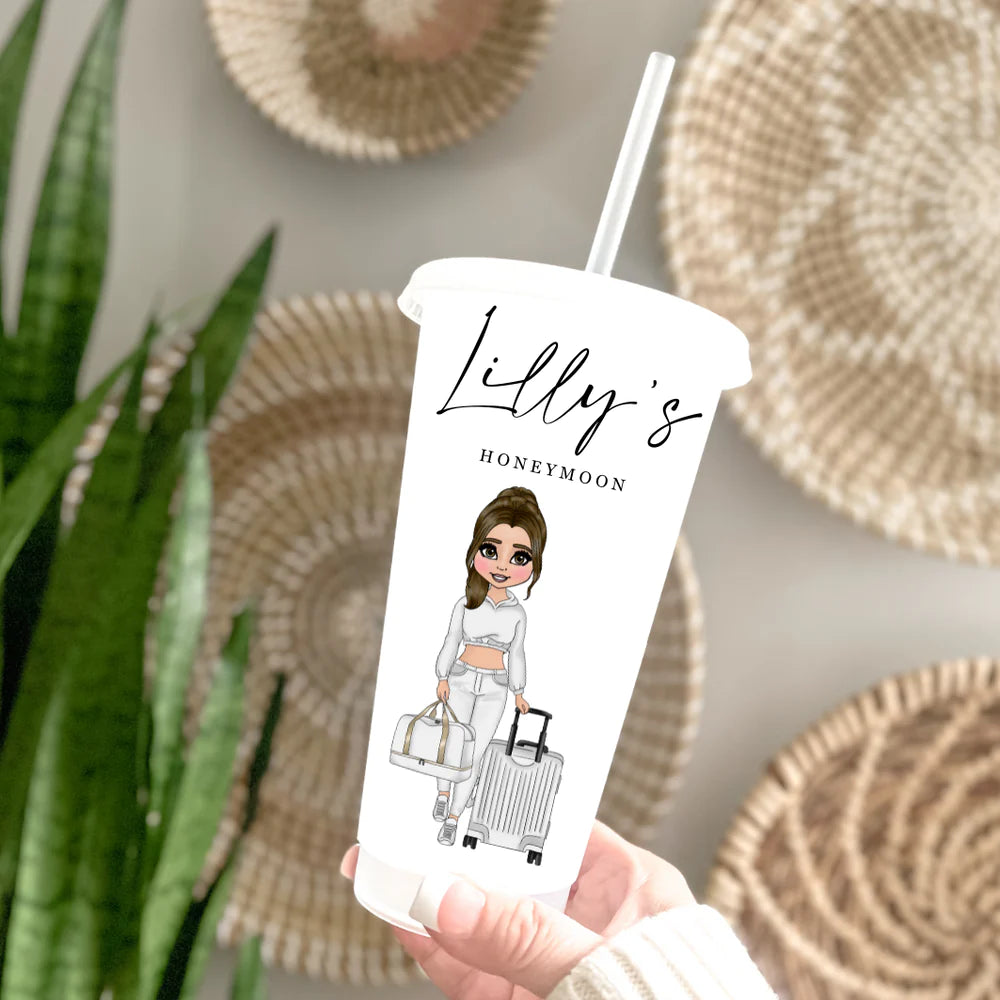 Celebrate your honeymoon in the cutest way possible with our Honeymoon Cold Cup featuring an adorable illustration of a woman with a suitcase. This cup is the perfect companion for your romantic getaway, keeping your drinks cold and refreshing while adding a touch of personalised charm.